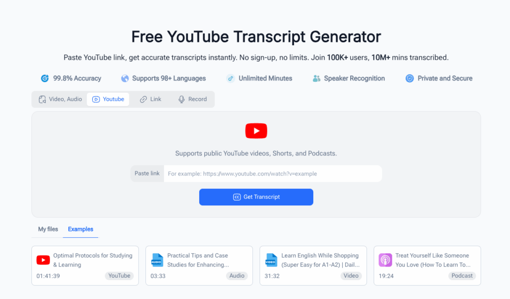 Speed is Transkriptor’s superpower. This YouTube video transcriber processes a 60-minute video in 4 minutes. Paste your URL, choose “Fast” or “Accuracy” mode, and get auto-corrected transcripts with speaker ID for up to 10 speakers and timestamps.