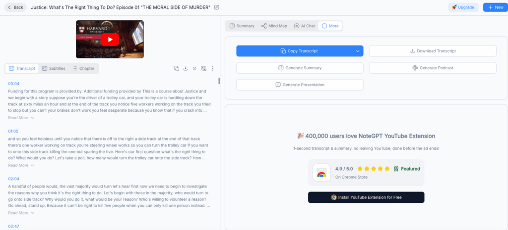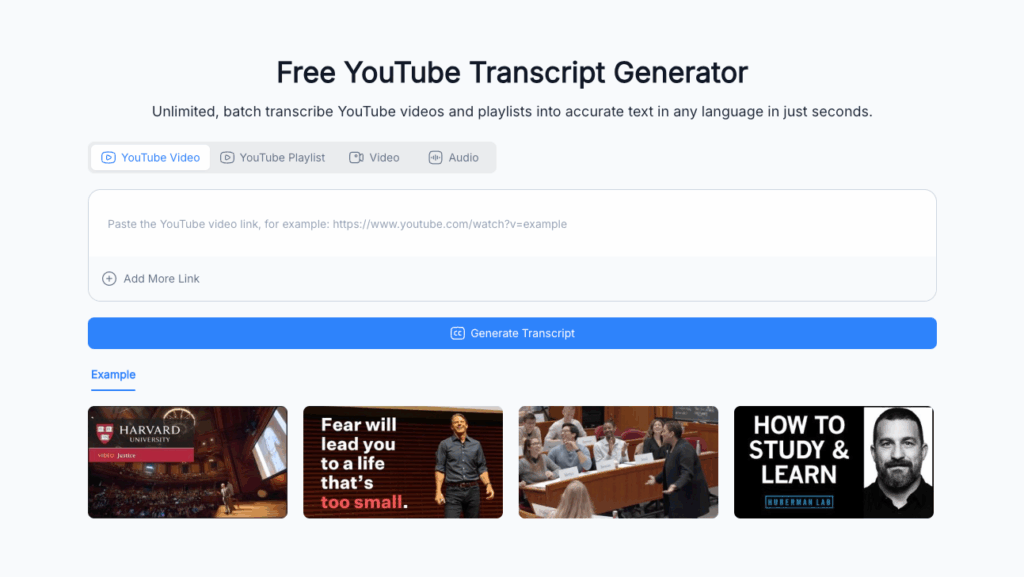 More than a YouTube video transcriber, NoteGPT is an AI content companion. Paste a YouTube URL, hit “Transcribe”, and get a full editable transcript in 60 seconds. Plus AI-generated key takeaways and blog outlines.
