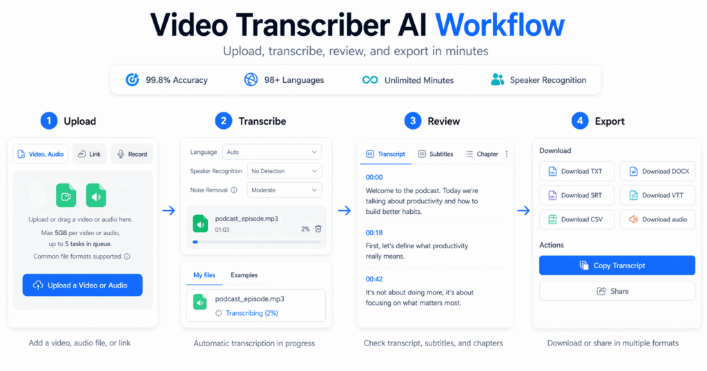 That matters because most users do not begin with a complex workflow. They begin with one file. One lecture. One interview. One meeting recording. One YouTube video. One short piece of content they want turned into text. In that moment, the best tool is often the one that lets them move from page load to upload as quickly as possible. Video Transcriber AI is easier to position around that kind of behavior. Its public workflow copy is simple: upload the file, let AI transcribe it, then review and reuse the transcript.