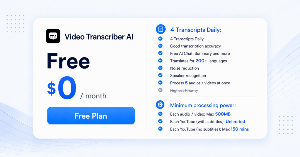 This is where Video Transcriber AI makes the clearest case for most users. The public free plan is not just “available.” It is actually shaped like something a normal user can do useful work with. Four daily transcripts gives you more room to test. Processing 5 files at once is far more forgiving than one-by-one handling. Highest priority matters because waiting is part of friction too. And the addition of AI chat, summary, speaker recognition, and noise reduction makes the free experience feel like a starter workflow rather than a locked teaser.